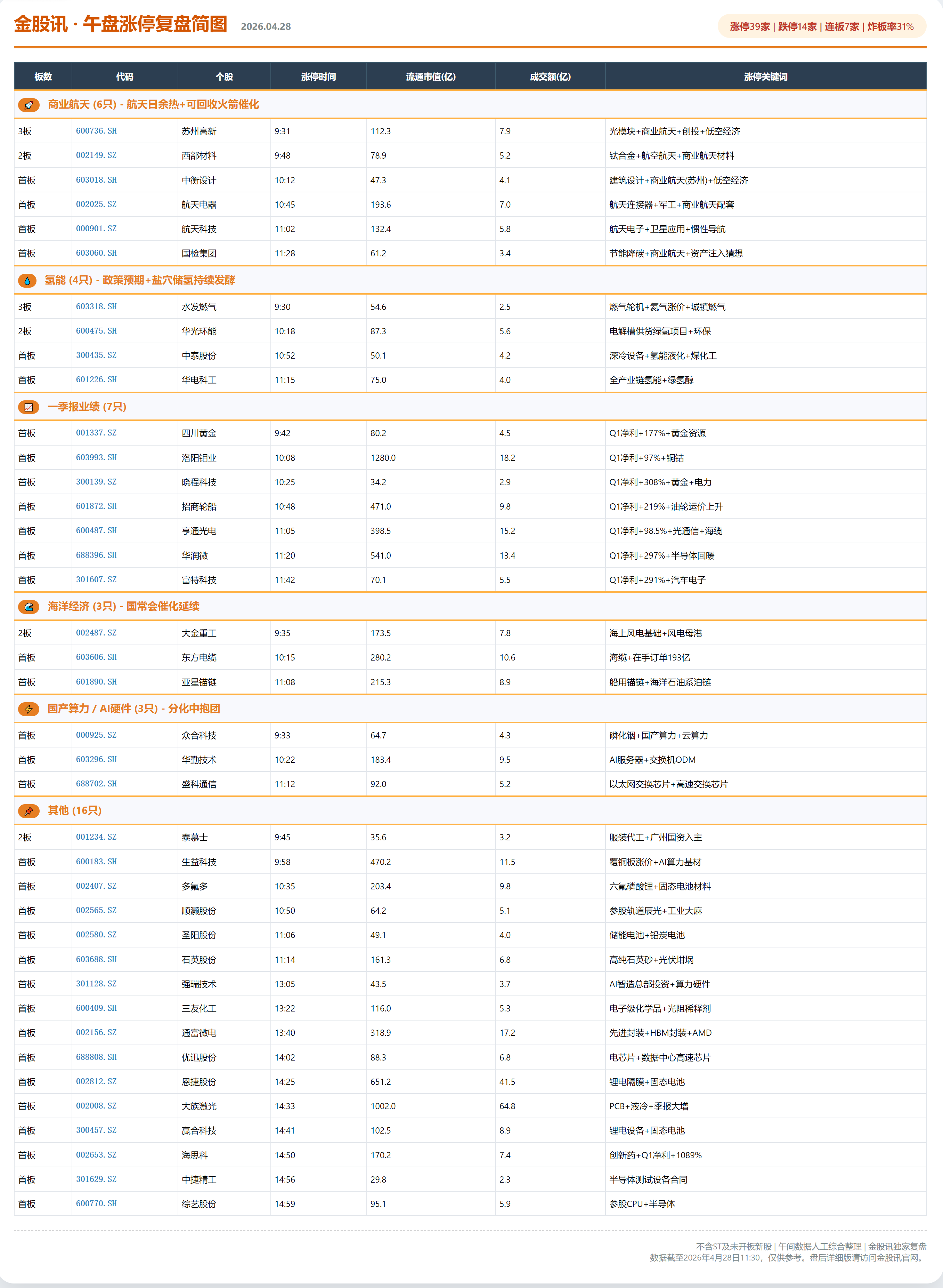 金股讯 · 午盘涨停复盘简图(2026.04.28)